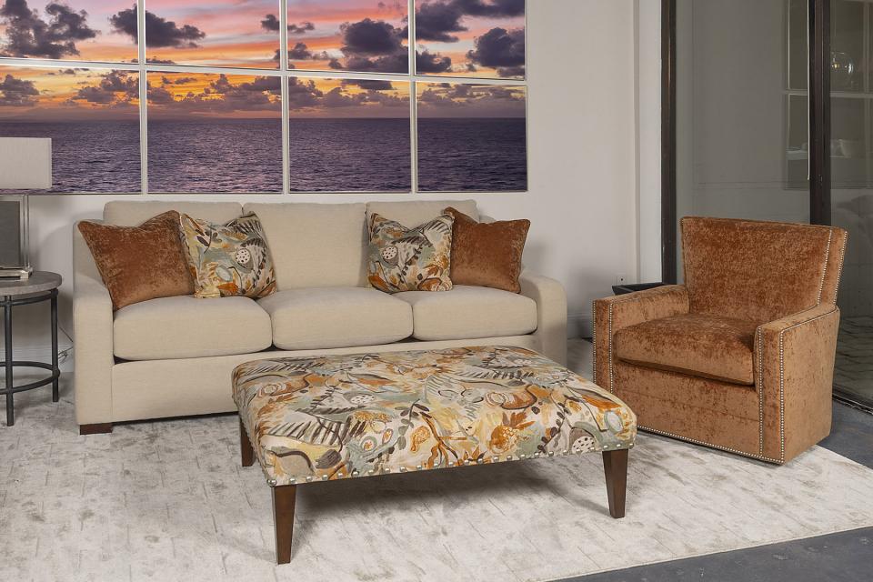 **4100-33W-F** Fresno Sofa in Botany Linen with Licata Apricot and Parker Apricot pillows.