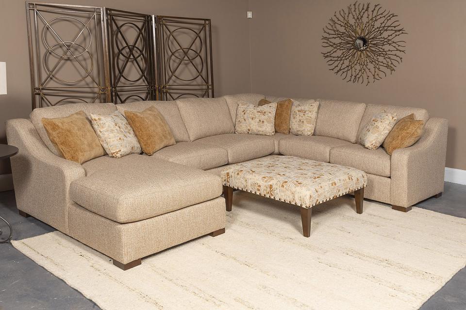 **4182-F** Fresno LAF Chaise in Mateo Toffee with Artisanal Toffee and Mia Toffee pillows. 4174-F Fresno Armless Loveseat in Mateo Toffee with Artisanal Toffee and Mia Toffee pillows. 4163-F Fresno RAF Corner Sofa in Mateo Toffee with Artisanal Toffee and Mia Toffee pillows. W-007-3636-F Moderne Cocktail Ottoman in Artisanal Toffee.