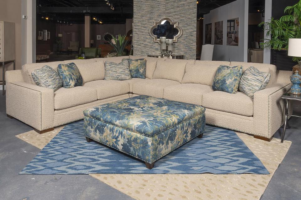 5861-F California Corner Chair in Popcorn Cafe with Bucolic Cobalt and Copperline Cobalt pillows.