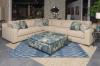 **5872-F** California LAF Loveseat in Popcorn Cafe with Bucolic Cobalt and Copperline Cobalt pillows.