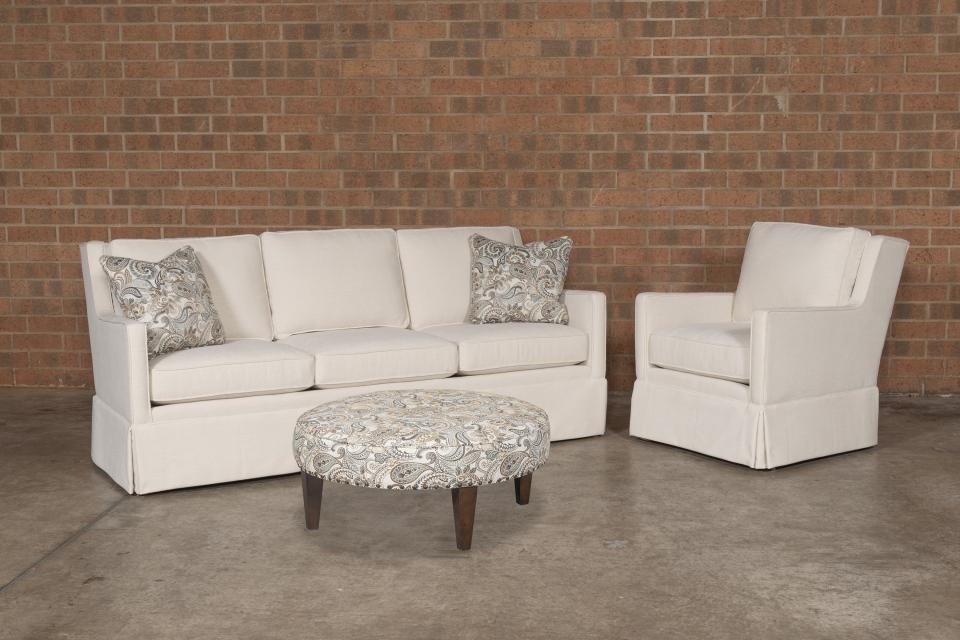 **3700-F** Lizzy Sofa in Sarah Natural with Jaden Pecan and Townsend Pecan pillows. 3701-F Lizzy Chair in Sarah Natural. W-010-36-F Rounder Cocktail Ottoman in Jaden Pecan.