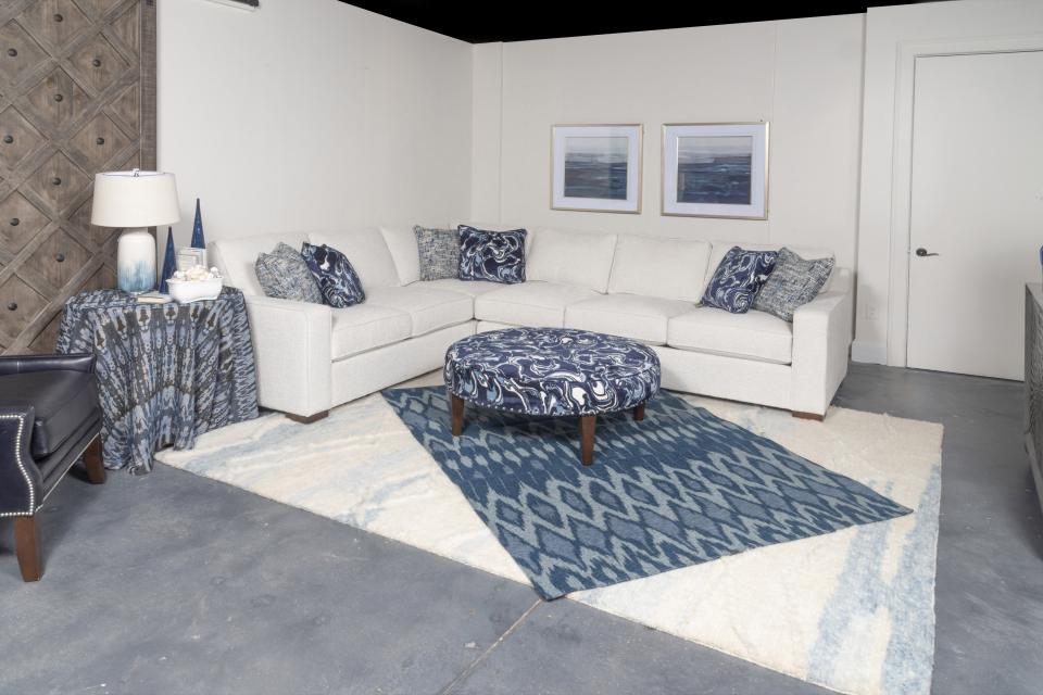 **9162-F** Chelsea LAF Corner Sofa in Envy Snow with Rhapsody Indigo and Mercury Indigo pillows.