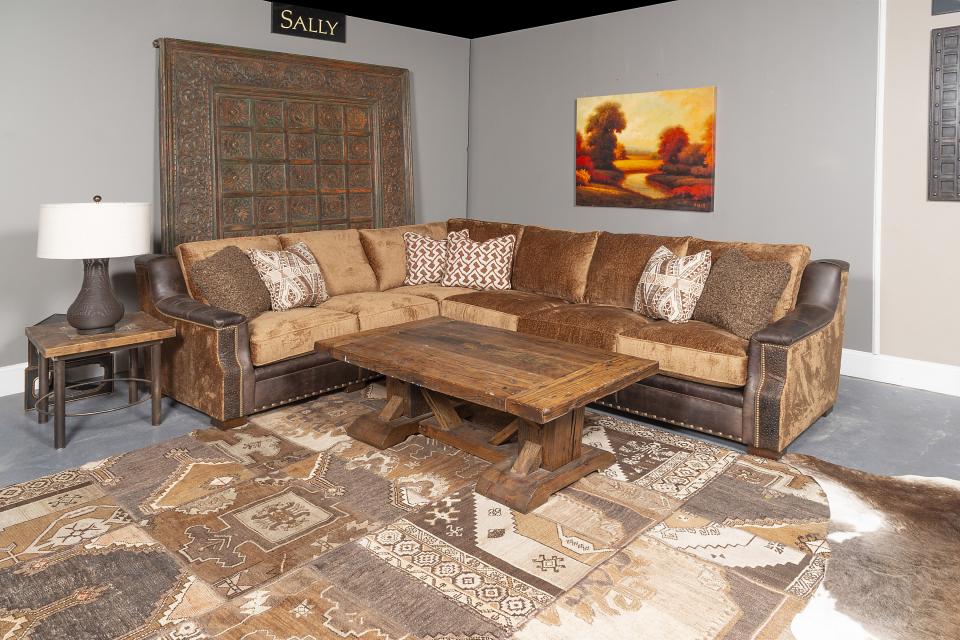 **2463-LF** Sally LAF Corner Sofa in Preserve Gravel, Buckshot Truffle and Chunky Chestnut with Spur Saddle, Reno Prairie and Lambkin Walnut pillows. 2453-LF Sally RAF Sofa in Preserve Gravel, Buckshot Truffle and Chunky Chestnut with Spur Saddle, Reno Prairie and Lambkin Walnut pillows.
